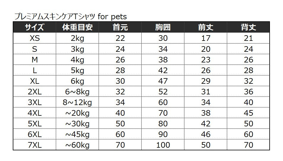 より多くの子が着られるようにXSから7XLまでの11サイズ展開。2~60kg(目安)の子までのサイズを用意しました。